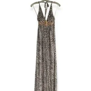 Sky Leopard Print Rhinestone Beaded Maxi Dress XS Halter Open Back Glam Y2K NWT