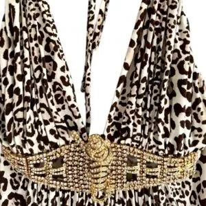 This floor-length statement piece features a striking brown and black leopard print with a dazzling rhinestone-beaded waist detail that adds sparkle and dimension. The halter neckline and dramatic open back create a sleek, flattering silhouette that feels glamorous yet effortless.
