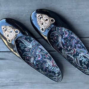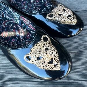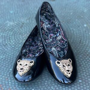385 Fifth flats, patent leather ballet flats, leopard embellished shoes, cheetah accent flats, size 7.5 women’s shoes, glossy round toe flats, statement ballet flats