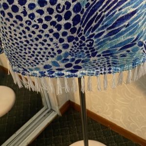 Stylish tunic with vibrant blue and white pattern. Features long sleeves and fringe hem. Perfect for casual wear. Wore for a Bluey event with my kids!