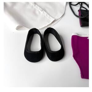 • Black suede velvet ballet flats. Ribbon trim. Black sole.