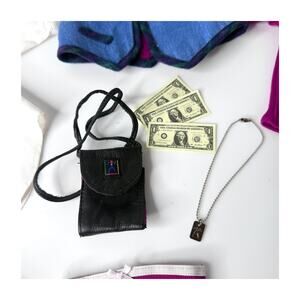• Black wallet purse. Crackled vinyl. Clear pocket for ID card. Internal pockets. Lined with AGoT print (like on vest reverse). Thin shoulder strap. Snap closure.