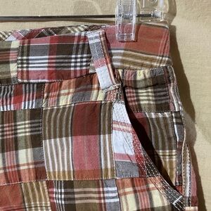 Larry Levine Size 4 Plaid Shorts. Stylish plaid patchwork shorts featuring a blend of red, brown, and white colors. Perfect for casual outings. Zip-up the front with a clasp. In great shape. Made of 100% cotton. Across the waist laying flat is approximately 15-1/4”.