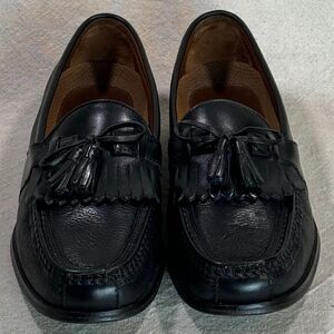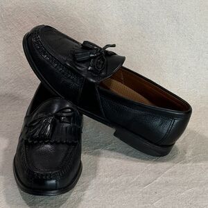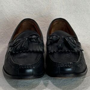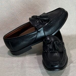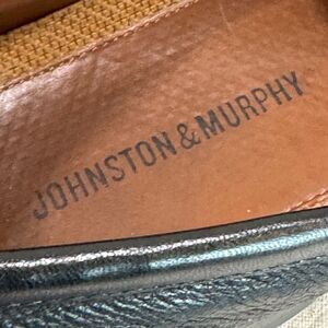 Previously worn, leather uppers-- pebble textured and contrasting smooth leather trim; kiltie/tassels; full leather lining, full cushioned leather insoles, leather outsoles with rubber wear guards; rubber heels. Shoes are in excellent condition; light wear on soles and heels; scuff at the back of the heel on left-- polished over and not noticeable. #johnstonandmurphy #bootandshoetraders