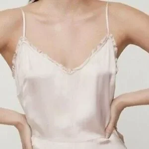 Aritzia Wilfred Millie Slip Dress in Rose Quartz size small. Pale pink color in a super soft satiny type of material. Slip dress with waist seam and ruffle detailing at neckline. Side zip closure and adjustable straps. There is a small stain on the front of the skirt (see last photo) but haven’t tried to remove at all so not sure if it would come out with a cleaning. Other than this in great condition.
