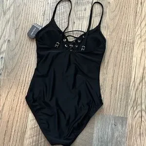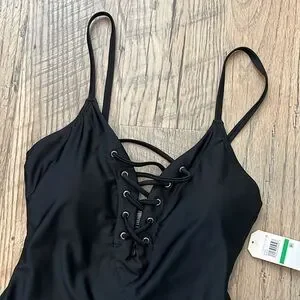 Nautica Lace Up Plunge Swimsuit, black, criss cross front, adjustable straps, slimming, seamless fit, shape enhancing, size large, New with tags.