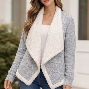 Stylish Sweater Jacket with cozy Sherpa lining. Perfect for layering. Open Front . Adds elegance to any look.