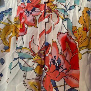 NWOT Beautiful Hale Bob Los Angeles floral blouse featuring vibrant red, coral, yellow, blue, and pink botanical print on a white base. Feminine silhouette with pleated front detail, ruffle sleeves, and button-front closure.