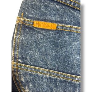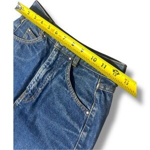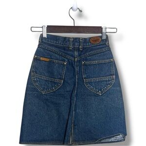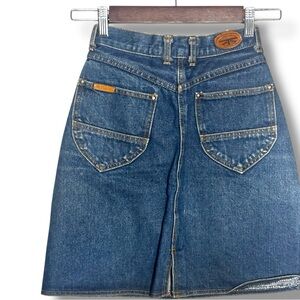 No brand, great pre-owned condition with little to no wear; a-line style, classic high waisted dark blue denim Mini skirt, zipper and button closure, functional front and back pockets, Brown leather details