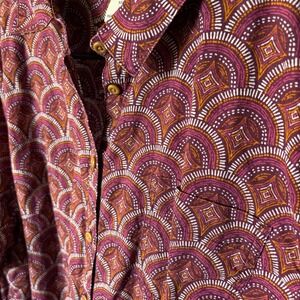 Sustainable hemp and organic cotton blend button-down Artisan Hemp shirt from Duluth Trading Co. This lightweight top features a vibrant geometric fan or shell print in shades of plum, magenta, and orange. Designed with a classic collar, full button front, side pockets, and long sleeves with button cuffs, it offers a relaxed fit perfect for casual wear or outdoor activities. The breathable fabric blend provides natural odor resistance and durability. Includes a single chest pocket and a curved hem for a polished look tucked or untucked.