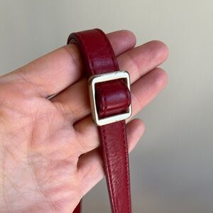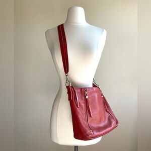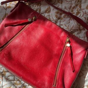 Fair condition, shows wear and tear. However, the shorter strap was never used and is in new condition. Bright cherry red color- see pics in shady indoor lighting vs bright sunlight. Zippers work. Thanks for looking!