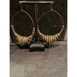 Brass tone large hoop earrings stacked metallic rings and beads