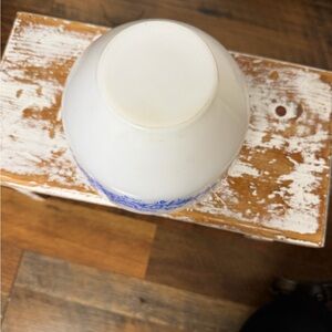 This vintage Federal Glass serving bowl is a beautiful addition to any collection. The round bowl features a stunning blue flower pattern on a white milk glass background. The bowl is made in America and has a production style of milk glass with a fused glass production technique.