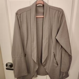 Elegant open-front blazer. Features sleek zipper details. Perfect for layering.