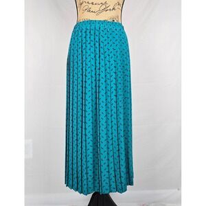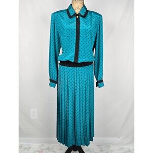 Vintage two-piece skirt set features a vibrant teal fabric adorned with a black paisley print. The blouse is styled with a contrasting black collar, button-front closure with a decorative gold-tone top button, and long sleeves with black-trimmed cuffs. The matching midi-length skirt is designed with sharp accordion pleats and an elasticized waist for comfort. Crafted from lightweight polyester, this coordinated ensemble offers a sophisticated 1980s aesthetic.