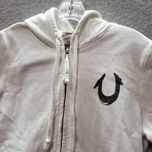 VINTAGE True Religion Women Sweatshirt Large White Hoodie Full Zip Short Sleeve