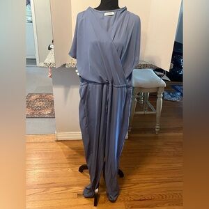 Stylish blue jumpsuit with a wrap design. Perfect for any occasion.