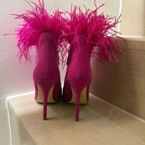 MK Whitby, a glamorous shoe with an unexpected twist. Feather trim adds tactile interest to the suede silhouette, while a stiletto heel creates a leg-lengthening effect. Style yours with a black dress and tights on your next night out.