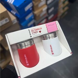Stanley Go Tumbler set includes a bold red and a crisp white tumbler. Perfect for travel and daily use.