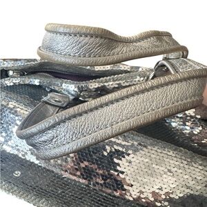 Exterior: Adorned with all-over silver-toned sequins and accented with metallic leather trim.