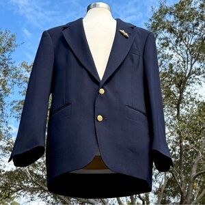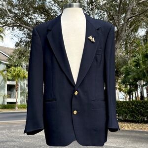 Vintage Evan Picone Blue Blazer Size 44R Wool Gold Button Vented Sailboat Brooch