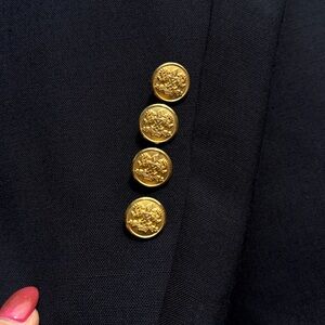 This fine blazer has an indelible blue wool construction and custom-designed gold buttons. It is a fashion-forward, versatile piece that is effortlessly sophisticated and crafted with meticulous construction.