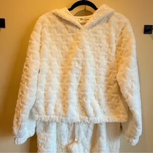 Soft and cozy No Boundaries plush fleece 2-piece lounge set in white. Includes textured hoodie and matching jogger sweatpants. Ultra-soft feel with elastic waist and relaxed fit — perfect for lounging, travel, or cozy nights in.
