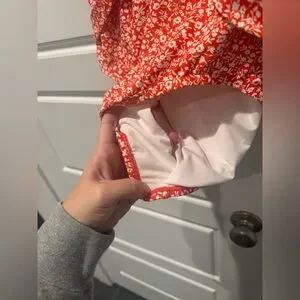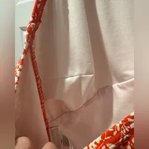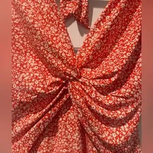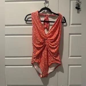 Full coverage bottom, deep plunge neck line with a flattering twist, halter tie at the neck, no padding. Like new.