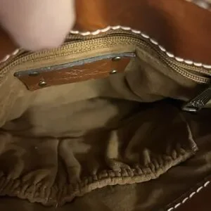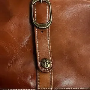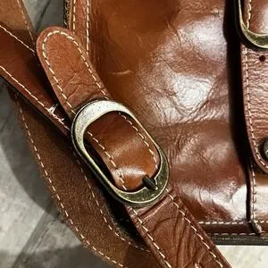 Patricia Nash "Venezia" Tan Leather Crossbody is suitable for both men and women. Crafted from high-quality leather with brass gold hardware, this medium-sized rectangular bag features a snap closure and an adjustable crossbody strap for comfortable wear. The classic tan exterior and brown sueded fabric lining give it a sophisticated look, perfect for those who appreciate a blend of boho and Western core styles. Excellent preloved condition. One watermark on top strap, see last photo.