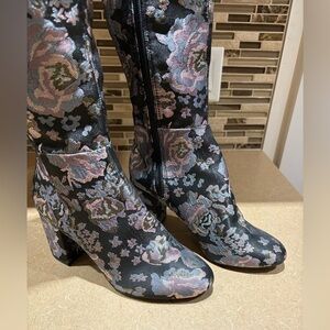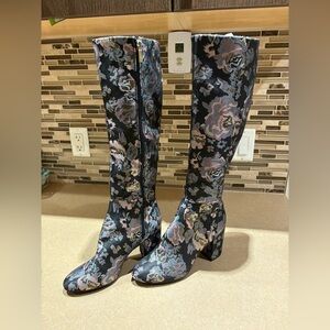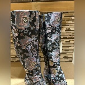 Kenneth Cole “Time to Step” floral fabric, knee high boots. Size med 8, measures 19” high, including the heels . Heels measures 3” high.