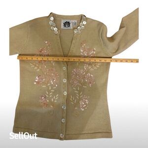 Keywords: Storybook Knits, cardigan, extra small, beige, floral embroidery, vintage, chic, elegant, fall, casual, V-neck, long sleeve, women's sweater, pre-owned.
