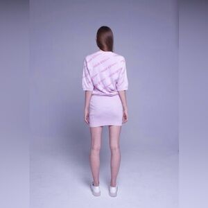 Logo password print dress, with pattern on top half, and solid color bodycon skirt on bottom half.