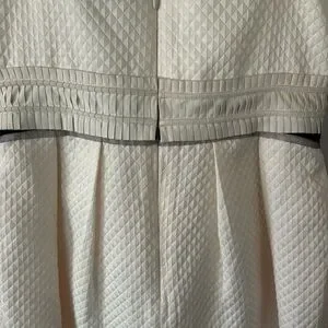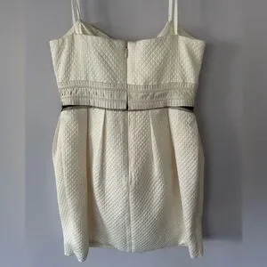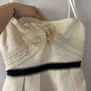 Elegant bone colored jacquard dress by BCBG Max Azria. Perfect for special occasions. Bubble skirt with black ribbon waist and leather rosette detail. Dress is in excellent condition. No rips, tears, or stains. Waist is 14 inches across and waist to hem is 18 inches.