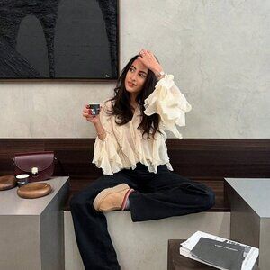 Tan Casual Women's Ruffle Trim Lantern Blouse Shirt