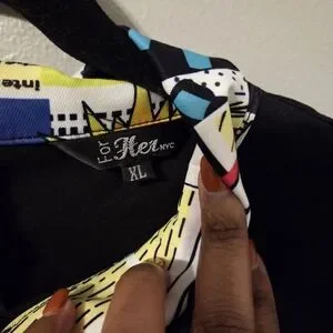 The For Her NYC Women's Comic Newsprint Hi-Low Colorblock Y2K Indie Dress in size XL is a unique and stylish garment perfect for various occasions, from casual outings to parties. The dress features a black and multi-color newsprint/colorblock pattern with puff sleeves and a collared neckline. It has a zip/button closure and is made of a comfortable blend of ice cotton and polyester. The asymmetric hi-low design adds a trendy touch, while the tie and ruffle accents offer a playful detail. Perfect for those who appreciate art, rock, punk, and colorful bohemian themes in their fashion choices. Cosplay