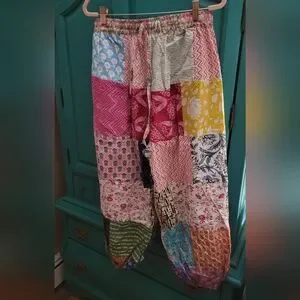 Vibrant patchwork joggers featuring a mix of colors for a bold look. Perfect for casual outings and comfortable wear.