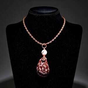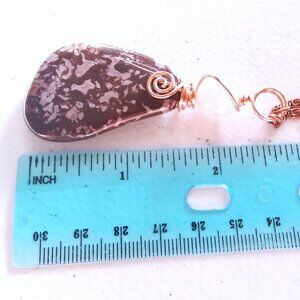 Deep brown Jasper (?) stone w. pink speckles, topped by a Rose Quartz bead, wire wrapped with copper jewelry wire. I upgraded the plain chain shown on the busts with a lovely textured "Greek Key" style chain shown in the flat lay photos. This ornate copper chain is hardwired into the pendant and measures right at 23" and is not adjustable. If you want this shorter, please ask me to trim it for you, before you purchase.