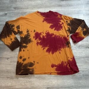Oversized long sleeve tee from We The Free by Free People in a bold tie-dye pattern featuring fall-inspired tones of burnt orange, maroon, and deep brown. Made from 100% cotton with a relaxed, boxy fit—easy to throw on with jeans or leggings. Boho and cozy, with machine-washable ease.