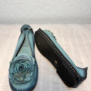 Boho style teal leather moccasins, featuring exquisite floral accents. Perfect for adding a touch of free spirit to any outfit. New without tags.