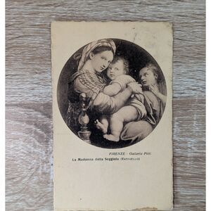 Beautiful antique Italian art postcard featuring “La Madonna della Seggiola” by Raphael (Raffaello) from Galleria Pitti, Florence (Firenze), Italy.