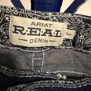 Denim jeans with paisley trim. Features Ariat branding. Ideal for everyday style.