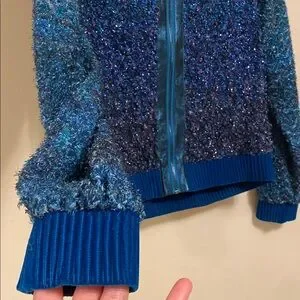 Stunning blue sequin jacket. Features ribbed cuffs and collar. Perfect for a night out.