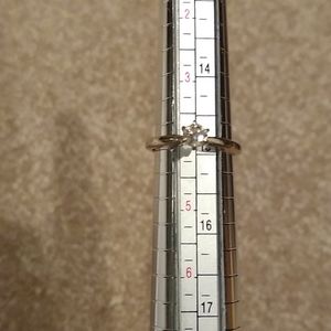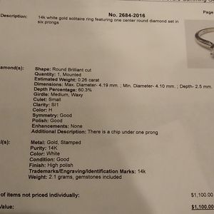Smoke-free home. Shape is round, brilliant cut. About .26 carats. Clarity is si1, color h. There is one chip under one of the prongs. See attached photo for appraisal. You cannot see the chip. There are six prongs. Size 4. I'm selling this for my nephew. He got engaged to a young lady and decided not to marry her. She was tiny. Probably 5'1 and 100 lb soaking wet. Its set in 14-karat white gold and can be resized. The diamond is very clear. No cloudiness.
