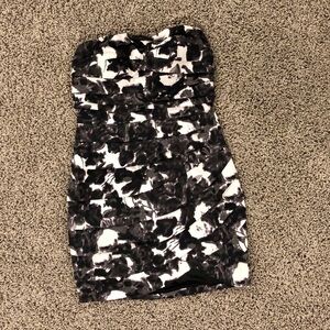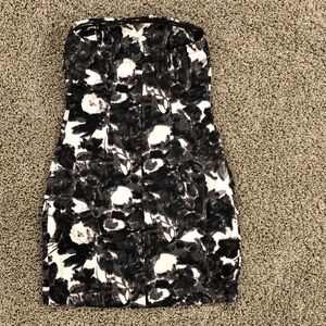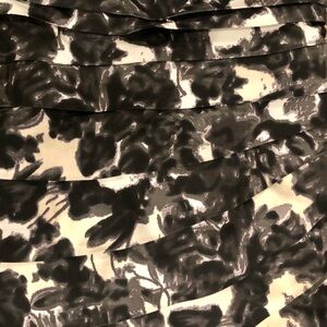 Black and white cocktail dress. Tiered style in the front, but not in the back. Short length (approx 27”) with hemline raised slightly in the front over the left leg (see picture). Size small in great used condition. Lightly lined top with zipper closure. Has elastic at the back for a better fit and “grippy” trim along the top of the front to minimize sliding
