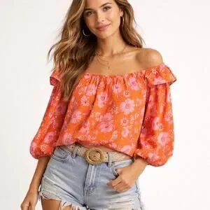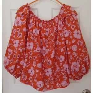 Free People Orange Pink Floral Off Shoulder Peasant Top L EC