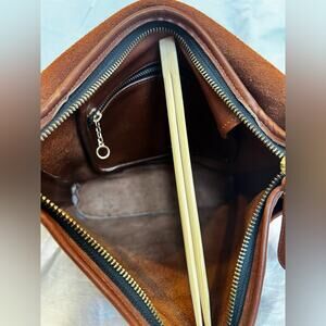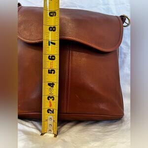 A timeless "workhorse" bag from the early 1990s. Crafted from Coach’s iconic, thick glove-tanned leather in a rich brown. This minimalist messenger-style bag is perfect for daily use, fitting a tablet, book, and all your essentials. Large front flap closure over a secure zippered main compartment. Large front slip pocket (under flap) and a full-width exterior back slip pocket for easy access to your phone/keys. Unlined suede interior with one zippered wall pocket. Solid brass buckles and hardware. Adjustable leather strap for shoulder or crossbody wear.
