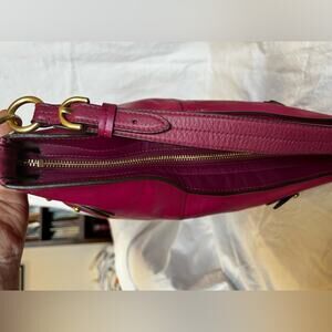 Elevate your everyday look with this beautiful Coach Colette Leather Hobo in a vibrant jewel-toned Plum/Magenta. Crafted from supple natural leather, this bag features a classic slouchy silhouette with sophisticated gold-toned hardware. Genuine natural leather. Polished gold-toned buckles and iconic circular "CC" logo. Roomy main compartment with zip and slip pockets.