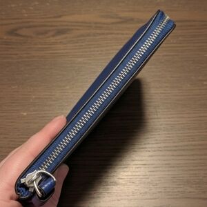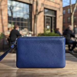 Elevate your everyday essentials with this stunning, authentic Coach Corner Zip Wristlet. Featuring the iconic Horse and Carriage logo deeply embossed in a vibrant "Vivid Blue," this piece is both a functional wallet and a stylish statement accessory.