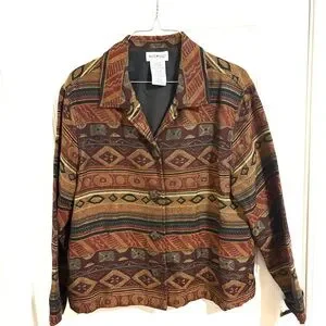 Stylish blazer with bold stripes. Features a mix of earthy tones. Ideal for a chic, casual look.