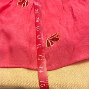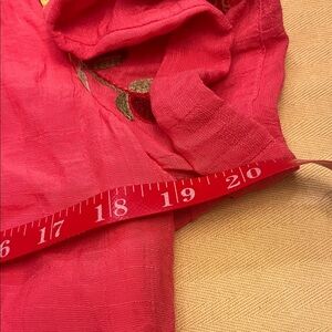 Chic coral midi dress with floral embroidery. Features button-up front and tie waist. Ideal for versatile styling.